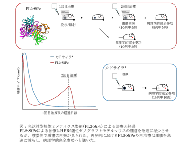 研究グループは、人工的に合成された、製造しやすく腫瘍細胞表面に存在する抗原特異的に結合する抗体ミメティクス薬剤と、人工的に設計された、光を当てると一重項酸素を従来薬より多く作るAx-SiPcを結合させた治療薬「FL2」を開発した。FL2はヒト乳がん細胞に発現しているHER2分子に特異的に結合する。このため、マウス体内へ投与されたFL2はマウスへ移植されたヒト乳がん細胞へ集積する。これまで、マウスにヒト乳がん細胞を移植し成長させ、FL2治療を1回行った場合、肉眼的には腫瘍が消えたように見えても、病理検査ではがん細胞の一部が残存し、5割が再発していた。