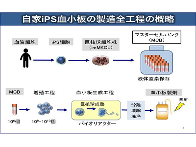 患者から採取した血液細胞からiPS細胞を作製。その細胞から、巨核球細胞株を作り出し、品質が良く安全性に問題がない株を「マスターセル」として凍結保存した。このマスターセルを解凍し、培養液中で巨核球を増殖させた後、「乱流型」のバイオリアクターや新規薬剤を用いて血小板の産生を行った。血小板を分離・濃縮・洗浄した後、放射線照射により増殖できる細胞を根絶させた。