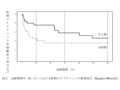 対象者60人のうち、6か月の追跡調査が完了したのは51人(追跡率85%)だった。転倒は、2か月間で、対照群において7.7%発生したのに対し、介入群では発生しなかった。2か月以降は介入群でも転倒がみられ、両群間で有意差はみられなかった(Kaplan-Meier法で比較分析を実施)。なお、両群ともに、転倒に伴う怪我や外傷などの有害事象は発生しなかった。また、ヒヤリハットは、3か月間で介入群が有意に少なかった(p<0.05)が、3か月以降は両群間で有意差はみられなかった。
