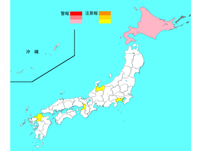 全国の保健所地域で、警報レベルを超えている保健所地域は1か所で、注意報レベルを超えている保健所地域は5か所であった。
