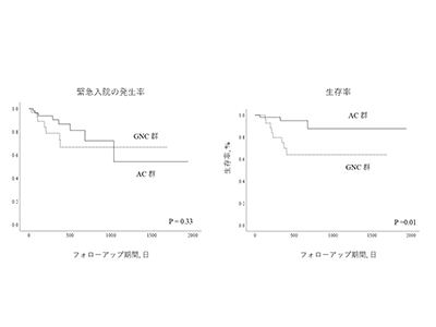 その結果、90人の患者(GNC群32人、AC群58人)が解析対象となった。緊急入院件数では、AC群で減少傾向を示し(GNC群11件、AC群9件)、2回以上の緊急入院ではGNC群3件、AC群0件で有意差が認められた(p<0.05)。緊急入院理由は、両群ともにALSの進行に伴う呼吸器疾患(誤嚥性肺炎、呼吸不全)による入院が半数を占めた。緊急入院の発生率では有意差を認めなかったが(p=0.33)、生存率では有意差が認められた(p=0.01)。
