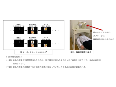 健常成人男性31名を対象に、バックワードマスキングという手法を用いて画像を認識できるように提示する条件(意識に上る条件)と、認識できないように提示する条件(意識に上らない条件)の2つの条件において、食品と非食品(身の回りの物体など)の画像をそれぞれ見てもらった。その後、画像を見ている間の脳の電気的活動を脳磁図で測定し、画像を見ている間の脳の活動が、意識的な機構と無意識的な機構では異なるか否かを調べた。