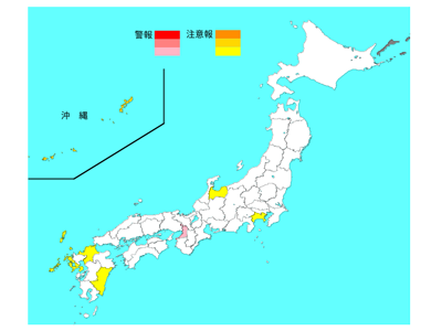 全国の保健所地域で、警報レベルを超えている保健所地域は1か所で、注意報レベルを超えている保健所地域は9か所であった。