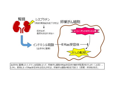 そこで研究グループは、シスプラチンの副作用で腎機能が低下した場合、血液中にISが蓄積し、ISの作用によって卵巣がんの転移が促進されるという仮説を立て、検討を行った。