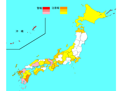 全国の保健所地域で、警報レベルを超えている保健所地域は23か所で、注意報レベルを超えている保健所地域は161か所であった。