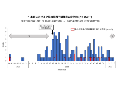 国立感染症研究所は3月29日、「国内における小児の原因不明の急性肝炎について(第3報)2023年2月16日時点の事例報告集計」と題した報告をウェブサイトに掲載した。厚生労働省(および国立感染症研究所)の調査における暫定症例定義を満たす可能性例は、2023年2月16日までに国内で156例報告されている。