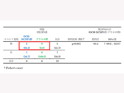 治験に参加した30人のうち、再発寛解型が18人、二次性進行型が12人いた。サブグループ解析の結果、二次性進行型の患者において治療目的となるNEDA達成は、プラセボ群では0%であったのに対し、OCH群で83.3%と有意に高かった(p=0.015)。二次性進行型において、より明確な有効性を示す可能性が明らかとなった。