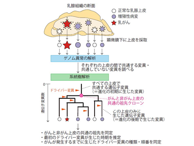 今回、研究グループは、がんと周囲の一見正常に見える組織を最新の技術を用いて詳細に解析することによって、がんの進化の歴史を詳細に辿り、正常な乳腺上皮がいつ、どのような順番でドライバー変異を獲得し、どのような遺伝学的・形態学的変化を経て乳がんが発生するに至ったかを世界で初めて明らかにすることに成功した。