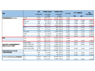 FN関連入院のリスク因子の解析を行ったところ、FEC療法、DTX+HP療法、TCH療法、TC療法など一部の薬物療法レジメン、65歳以上の高齢者で入院リスクの上昇傾向が、ペグフィルグラスチム一次予防投与で入院リスクの低下傾向が示唆された。
