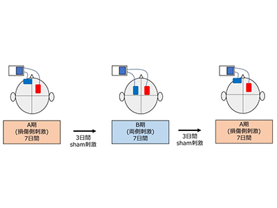 その後、A期では損傷側一次運動野へのtDCS刺激、B期では両側の一次運動野への刺激を併用しながら上肢トレーニングを行った。各セッションは1週間で、その間に3日間の偽刺激を行った。評価時期は各セッション前後とし、上肢機能はBox and Block Test(BBT)、Fugl-Meyer Assessment(FMA)、総指伸筋と浅指屈筋の筋活動および筋内コヒーレンス(β帯域:皮質脊髄路の興奮性を反映)とした。
