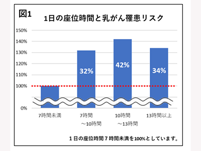 1日7時間以上座位、7時間未満と比較で乳がん罹患リスク36%高