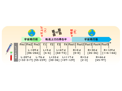 また詳細な解析の結果、ISS滞在直後に血清中量の減少を示したタンパク質(細胞接着・細胞外マトリックス構成関連タンパク質を含む)のほとんどは、ISS滞在1か月後には宇宙飛行前のレベルにまで回復しており、このような減少反応の多くは一過性のものであることがわかった。一方で、ISS滞在直後に血清中量の増加を示したタンパク質(自然免疫応答関連タンパク質を多く含む)の多くは、宇宙飛行直後に宇宙飛行前のレベルまで減少した。これらタンパク質の量的変動は、打上げに伴うストレス応答や宇宙空間での微小重力などの宇宙環境ストレスに対する生体内組織・細胞の適応機構を反映している可能性があるが、その影響は一過性であると考えられた。