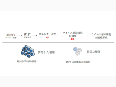 EBウイルス感染細胞はヒトの身体の中に潜み、いずれ腫瘍細胞へと変化すると考えられている。「EBウイルス感染細胞の安定的な細胞増殖にウイルス因子のBNRF1と宿主因子のIFI27が関与していること、BNRF1やIFI27を阻害するとEBウイルス感染細胞の病原性が低下することが明らかになった。BNRF1とIFI27はともに感染細胞でのエネルギー産生に関与しているため、ウイルスによるエネルギー産生が新たな治療標的となる可能性が示唆された」と、研究グループは述べている。