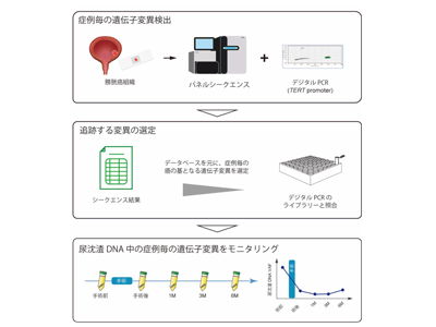 研究グループは、膀胱がん患者治療前後の尿沈渣(以下、尿中)から抽出したDNA中の遺伝子変異をdPCRを用いてモニタリングし、その早期再発診断バイオマーカーとしての妥当性を検討した。尿中には正常細胞も大量に含まれるため、膀胱がん細胞由来の遺伝子変異の割合は極めて少なくなっている。また、膀胱がん患者では尿中と同様に血液中でもがん細胞由来DNAが検出されることがある。今回、尿中の遺伝子変異とともに血中でも膀胱がん細胞由来DNAを測定した。