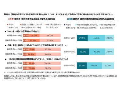 一方、医師調査では、2022年12月に改正難病法が成立したことに対して、「内容までは把握していないが、聞いたり見たりしたことがある」(46.5%)が最も多く、「内容を把握している」(29.5%)と続いた。「今まで見たり聞いたりしたことがなかった」が24.0%だった。