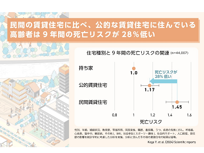 住宅は、健康にとって重要な要素の一つである。住宅には、持ち家と賃貸住宅があり、後者には民間賃貸住宅と公的賃貸住宅がある。公的賃貸住宅には、都道府県営、市町村営の公営・公社の住宅やUR都市機構(旧公団)による住宅が含まれている。持ち家に住む高齢者と比較して、賃貸住宅に住む高齢者は社会経済的に不利な立場に置かれている傾向があり、海外では公営住宅で死亡リスクが最も高いと報告されている。さらに、民間賃貸住宅と比較して、大規模かつ計画的に設置された公的な賃貸住宅は住まいを取り巻く環境が異なることが想像される。しかし、これまで、住宅種別の違いによる死亡リスクへの影響や、特に賃貸住宅におけるリスクの差は報告されておらず不明だった。