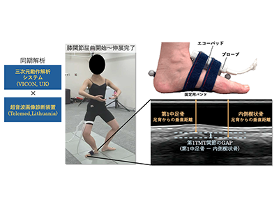 同研究では、外反母趾ほか下肢と足部に既往のない健常女性バレエダンサー16人を対象とした。股関節中間位(Control条件)、股関節最大自動外旋角度までに制限することで足部での代償を除いた肢位(Functional条件)、足尖が最大限外側を向くように指示をした肢位(Forced条件)の3つの測定条件を設定。バレエの基礎動作であるプリエを課題動作として実施した。膝関節屈曲開始から完全伸展位までの解析区間にて、超音波画像診断装置と三次元動作解析システムを同期させ、第1TMT関節の関節運動(第1中足骨と内側楔状骨の垂直変位量)を測定した。