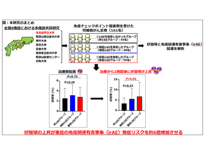 今回の研究から、免疫チェックポイント阻害剤を受けた腎細胞がん患者において好酸球の増加が、重症irAEの発症を予測するバイオマーカーとなる可能性を初めて見出すことができた。今回の研究成果は、生存期間に負の影響を与える重症irAEの発症を早期に発見し安全に免疫チェックポイント阻害剤を継続するために、好酸球の変動をモニタリングすることの重要性について新たな根拠を提供する。
