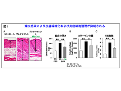 実験の結果、蠕虫に感染したマウスでは、ブレオマイシンにより肥厚した真皮が薄くなり、増加していたコラーゲン量が減少したことから、線維化が抑えられることがわかった。同時に、皮膚へ浸潤した炎症細胞であるT細胞の数も有意に抑えられることが確認された。さらに詳細な解析により、蠕虫感染がTreg細胞を増加させ、Th17細胞を抑制することが明らかになった。実験的にTreg細胞を除去すると、蠕虫感染による線維化抑制効果が消失したため、Treg細胞がTh17/Tregバランスの調整に重要な役割を果たしていることが確認された。