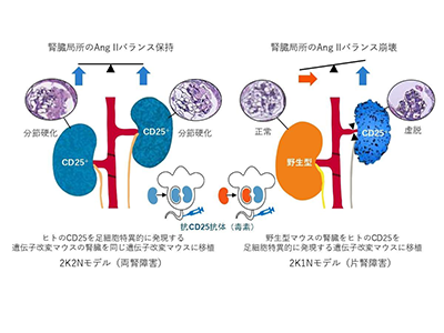 今回の研究では、糸球体の足細胞特異的にヒトCD25を発現するNEP25マウス(ネフローゼ症候群モデル)を用い、CD25に対する免疫トキシンLMB2を投与することで、足細胞障害(グロメルロパチー)を片側の腎臓にのみ生じさせることのできる2K1N(two-kidney, one-nephropathy、片腎障害)マウスモデルを作製した。