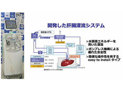 ドナーから提供された臓器は、移植されるまでの間、最適な状態で保存されることが重要である。従来は、移植用臓器を低温の臓器保存液に浸して保存する方法が主流だった。今回実施された「低温酸素化機械灌流保存法」は、従来の保存方法に加えて、低温の臓器保存液に酸素を混入し、灌流機械を用いて肝臓の血管内を循環させることで、肝臓が保存されている間の臓器の温度を低温に保ちながら酸素を供給する。これにより、細胞のエネルギー維持に必要なミトコンドリアを良好な状態に保つことができ、結果として、組織が良い状態に保たれる。また、移植後に肝臓に血液が再開された際に生じる虚血再灌流障害の軽減も期待できる。この保存方法は、欧米を中心に臨床応用され良好な治療成績が報告されているが、日本国内での実施は、今回が初めてとなる。