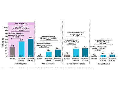その結果、オザニモド投与群はプラセボ群と比較して、12週時点で臨床的反応を達成した患者の割合が有意に高かった(オザニモド0.46mg:52.9%、P=0.0158、オザニモド0.92mg:61.5%、P=0.0006、対プラセボ:32.3%)。