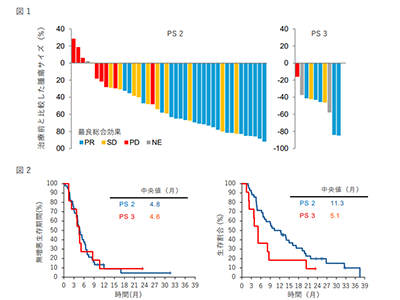 結果、参加者のうちPS2の26人(67%)、PS3の5人(50%)が導入療法を完了し、副作用により治療を中止したのは全体で12人(21%)にとどまった。がんが明らかに縮小した割合は51%だった。無増悪生存期間の中央値は4.7か月、全生存期間の中央値は全体で9.0か月、PS2では11.3か月と良好な結果となった。日常生活の制限は29人(55%)で改善した。