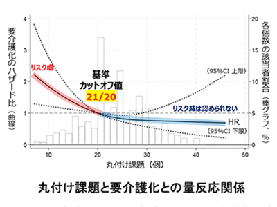 追跡期間中に248人(23.2%)が要介護2以上の認定を受けた。分析の結果、ペグ移動時間(AUC=0.74)と丸付け課題(AUC=0.70)は、将来の要介護化を予測する有効な指標であることが確認された。また、手指機能のカットオフ値を基準に良好群と不良群に群分けしたところ(良好/不良:ペグ移動時間37.9/38.0秒、丸付け課題21/20個)、どちらの評価項目においても、不良群は良好群と比べて、将来的な要介護化リスクが顕著に高まる(ペグ移動時間:約2倍、丸付け課題:約1.5倍)ことが明らかとなった。また、その後の分析において、これらの評価項目の成績と要介護化リスクとの間には曲線的な量反応関係があることがわかった。具体的には、手指機能の各評価項目が上述のカットオフ値を下回ると要介護化リスクが高まる一方で、カットオフ値より良好であっても、統計学的なリスクの減少は認められないことが示された。