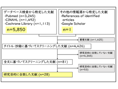 今回の研究では、病院内の騒音が入院患者の健康アウトカムに与える影響を明らかにするため、スコーピングレビューを実施した。PubMedやCINAHLなどの医学・看護系データベースから、noiseやsound、alarmなどのキーワードが含まれている5,851件の文献を抽出し、重複を除いた4,426件を対象に、2人の研究者が抄録によるスクリーニングを独立して行った。その結果、研究目的に合致する81件を特定し、さらに全文レビューを経て28件の文献を研究対象として抽出した。スクリーニング過程で意見の不一致が生じた場合、第三の研究者が介入し合意形成を行った。