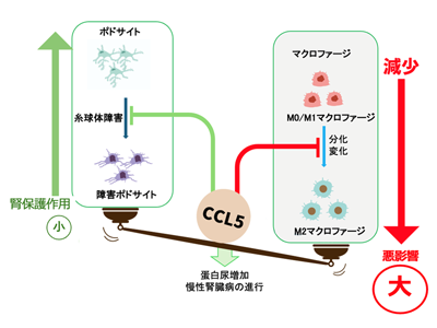 一方、CCL5がないマウスに慢性腎臓病を引き起こすと腎障害が悪化すると予想されたが、実際には腎障害が軽減した。この予想外の結果から、CCL5は、腎障害時に糸球体に浸潤してくる免疫細胞(マクロファージ)を介して障害を悪化に導くと考え、普通のマウスにCCL5がないマウスの免疫細胞を骨髄移植し、そのマウスに慢性腎臓病を引き起こしてみた。そうすると、そのマウスの腎障害は軽減した。さらに、CCL5のマクロファージに対する役割は、抗炎症性マクロファージ(M2)よりも炎症性マクロファージ(M1)を増やすことによって腎障害を悪化させることもわかった。