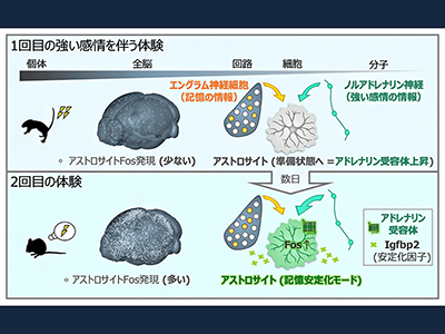 その結果、初回の恐怖体験後、アストロサイトは数時間~数日にかけてノルアドレナリン受容体(α1およびβ1受容体)を増やし、来るべき強い感情を伴う2回目の体験のために備える「準備状態」に入ることが判明した。ノルアドレナリン受容体の発現量と比例して、後の再体験時におけるFos発現アストロサイト(アストロサイト・アンサンブル)の数も変化することが明らかになった。この準備状態にあるアストロサイトは特に、再体験時にノルアドレナリン神経活動(感情の情報)とエングラム神経活動(詳細な記憶の情報)を同時に感知することで、分子スイッチオン(Fos発現)状態に切り替わることがわかった。