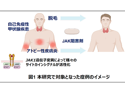 一般的にアレルギー性疾患は、環境要因を含むさまざまな外的な要因と、遺伝的素因が複雑に絡み合って発症する多因子疾患と考えられている。一方で、近年の遺伝学研究の進歩により、早期から発症する重症、または一般的な治療が効かないアレルギー・自己免疫疾患のある患者の中には、JAK(ヤヌスキナーゼ)やSTAT(シグナル伝達兼転写活性化因子)の機能獲得型(遺伝子の変異によって、タンパク質の働きが通常よりも強くなる)または機能喪失型変異(遺伝子の変異によって、タンパク質の働きが無くなる)による先天性免疫異常症が存在することが明らかになってきた。JAK1はIL-4、インターフェロンα、インターフェロンγなどさまざまなサイトカインの下流シグナル伝達に関与しており、その異常活性化は広範囲な炎症・自己免疫疾患を引き起こす可能性がある。