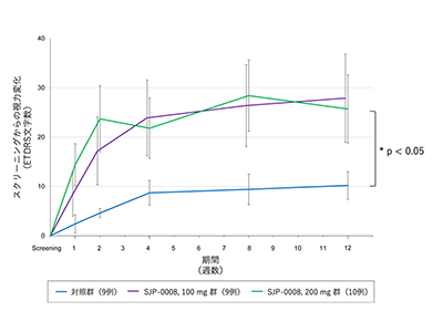 治験では、SJP-0008内服による安全上の大きな問題はなく、視力はEarly Treatment Diabetic Retinopathy Study(ETDRS)法による評価で5段階以上の改善が認められた。一方、SJP-0008を内服していない対照群のデータでは、視力の改善は2段階に留まった。このことから、SJP-0008の内服により視力改善が得られることが示唆された(p<0.05)。