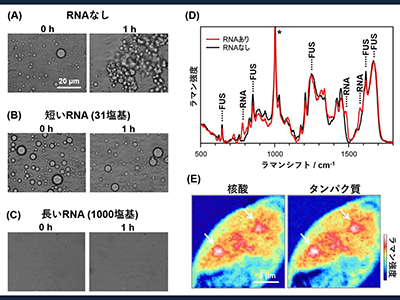 さらに、ラマン顕微鏡を用いて液滴内部の分子の状態を解析した。FUSの液滴に対して短いRNAを加えると、FUSの液滴内部にFUSだけではなくRNAの強い信号が観測された。この結果から、FUSの液滴内にRNAが自発的に濃縮されることで凝集を抑制することが示された。一方で長いRNAは液滴内部に取り込まれなかった。
