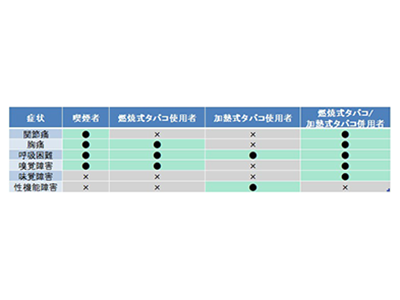 解析の結果、現在喫煙者では非喫煙者と比べて、4症状(関節痛、胸痛、呼吸困難、嗅覚障害)と有意な関連が認められた。併用者では5症状(関節痛、胸痛、呼吸困難、味覚障害、嗅覚障害)、燃焼式タバコ使用者では3症状(胸痛、呼吸困難、嗅覚障害)、加熱式タバコ使用者では2症状(呼吸困難、性機能障害)と、有意な関連が認められた。