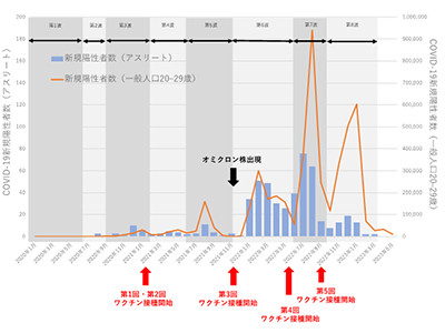 屋内競技アスリートで罹患が多い結果は先行研究と同様の結果であった。今回の研究で感染の正確なタイミングの特定はできなかったが、エアロゾル感染・飛沫感染・接触感染が主なCOVID-19の感染経路であることを考慮すると、近接距離での運動が影響した可能性が示唆された。長期離脱の頻度はオミクロン株出現前である第1波から第5波で15%、第6波から第8波で3%と有意に低下し、変異株の違いが復帰期間に影響した可能性が示唆された。また、同感染症感染拡大を防止するため緊急事態宣言が発出されたが、第6波以降はそのような行動制限の要請は行われなかったことも影響していると考えられた。