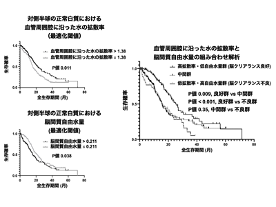 次に、生存期間との関連を検討したところ、対側半球の正常白質において、血管周囲腔に沿った水の拡散率の低下と脳間質自由水量の上昇が、年齢、性別、造影腫瘍体積とは独立して予後不良と関連することが判明した。さらに、局所白質構造の指標で追加調整しても、血管周囲腔に沿った水の拡散率は有意な予後因子として残った。
