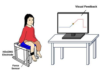 研究では、6~12歳の健常な小児18人と若年成人18人を対象に、膝を伸ばす動作(膝伸展)において、徐々に力を強めていくランプ収縮課題(最大筋力の50%まで)を行ってもらった。この際、外側広筋に64個の電極を持つシート(高密度表面筋電図)を貼付し、筋肉の電気活動を記録。記録された信号を数学的処理により分解し、個々の運動単位の発火パターンを追跡・解析した。