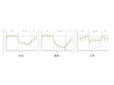 2.「外来」「調剤」「入院」にかかる医療費に分けてみてみると、「入院」医療費への影響は、「外来」と「調剤」に比べると半分程度であった。2割負担の人たちの医療費は1割負担の人たちに比べて、「外来」で4%、「調剤」で3~6%、「入院」で2%減少した。